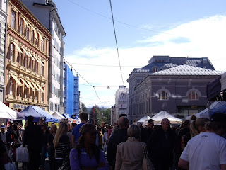 Sinon, hier, j’ai enfin acheté des vêtements ! Ah le bonheur, mieux encore quand tu fais des affaires. En fait, il y avait plein de stands dans la rue principale de Majorstuen, des stands de vêtements en solde, des super affaires. L’extase à l’état pur ! Et là, tu crois que tu es au summum de cet état, et non, y a une boulangerie qui offre des parts de gâteau norvégien gratuitement, si si ! Et la bouffe gratuite c’est toujours excellent. Ah quelle après-midi de folie !